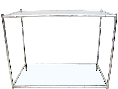 This mid century stylish and chic bar cart is chrome plated with glass inserts. The faux bamboo pattern evokes the taste and style of Tony Duquette and the Hollywood Regency style.