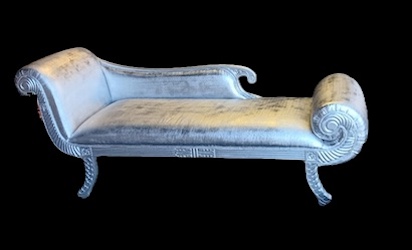Hand carved Chaise with scrolled arms and footrest. Highlighted with silver gilding and a rich glossy silver painted fabric. An outward scrolled arm reclines to the left. Pillows available to rent.