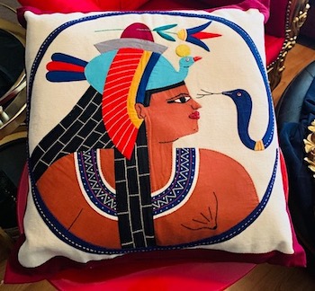 Sculpted with the red sun disk in the center, flanked by cobra snakes, and surrounded by wings. Painted in faux gold and the rich colors of the Egyptian palette.