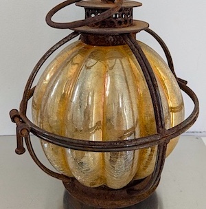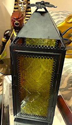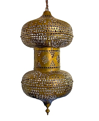 The large lamp has a onion shaped section on the top as well as the bottom with a cylindrical shape in the center. The pierced cut outs allow the single light bulb to shine through. A colored light bulb could be used for ambiance.