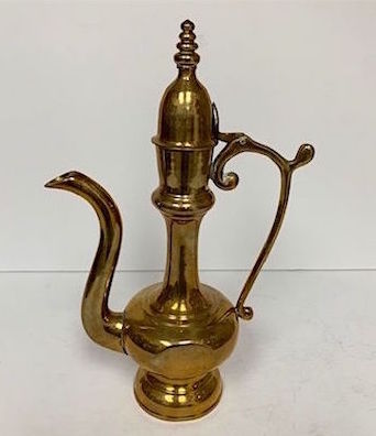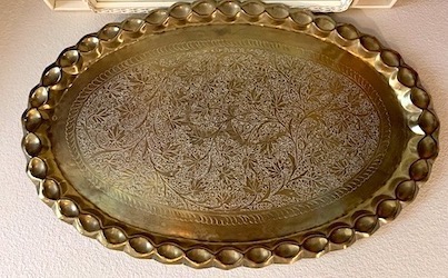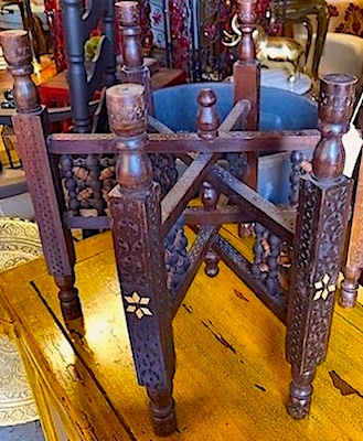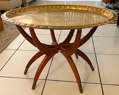 This low to the ground table is stunning with its intricate wood work on the base. The brass round tray detaches from the base which folds.