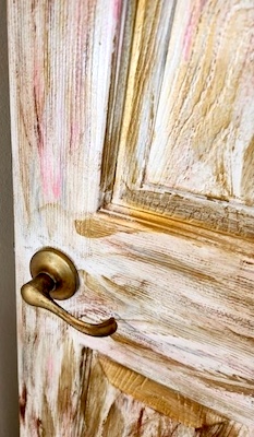 White freestanding door. Swings on a hinge.  The door comes pre assembled with the feet attached for pick up.