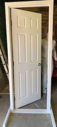 White freestanding door. Swings on a hinge. The door comes pre assembled with the feet attached for pick up.