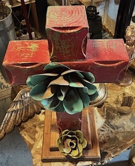 This item is a handmade, distressed wooden cross featuring large, metal turquoise and green flowers. Can be used as a rustic decor on a farm or a western event.