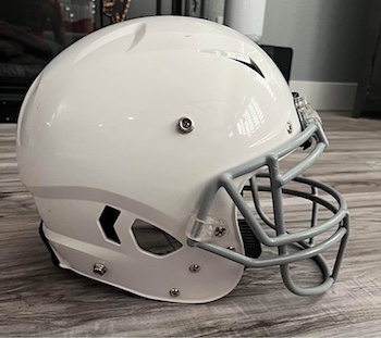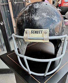 The helmet's surface is intentionally distressed to give it a vintage, game-worn look. Adult size, no foam insert.