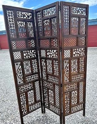 This room divider features a three 18" W panels with molded borders and eclectic ornate carvings, the open design – allow light to pass through.